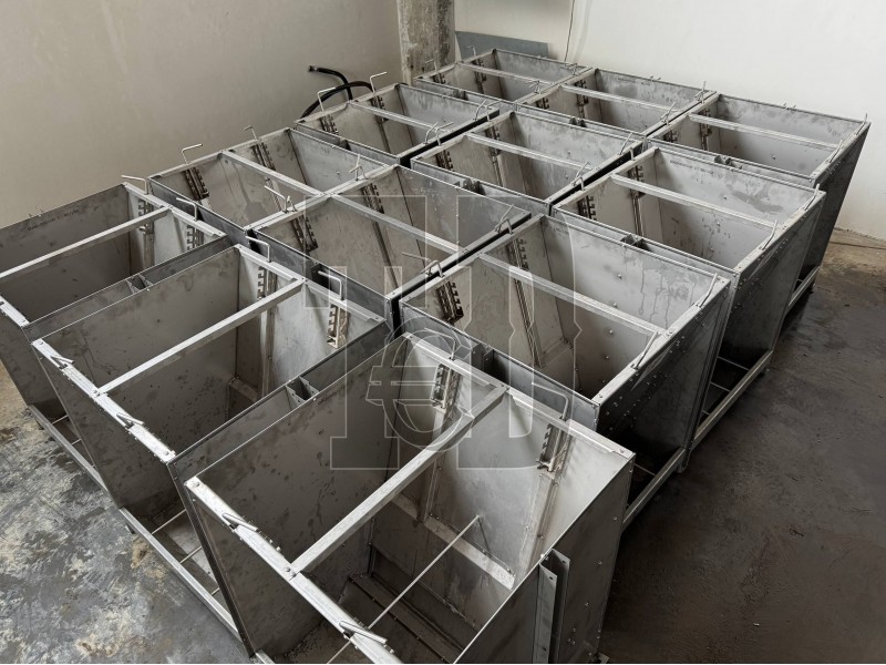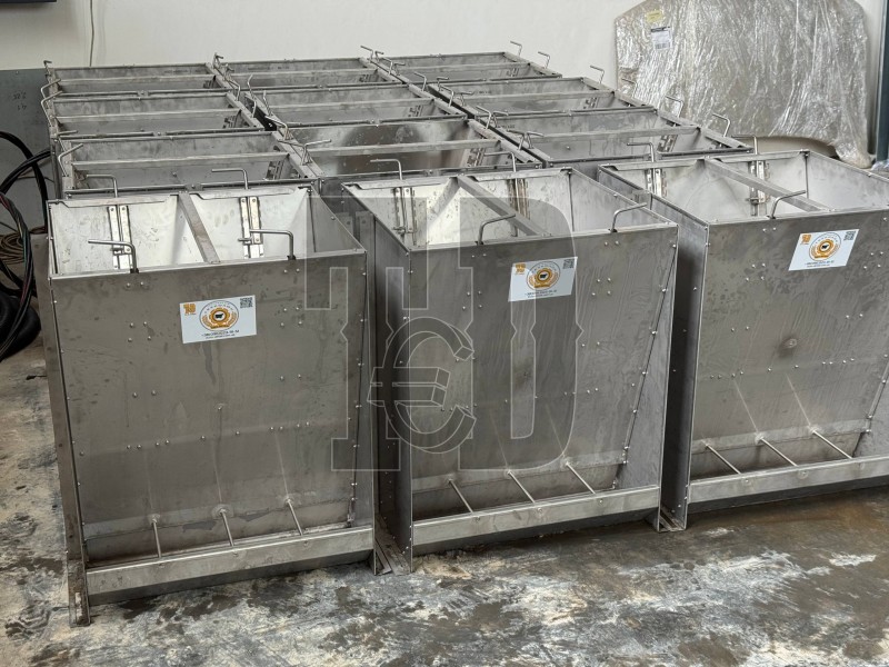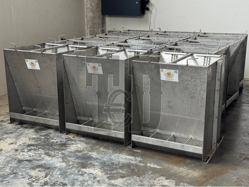 For piglets on rearing, the feeder can be single or double-sided, the width of the feeding area is 15 cm, the number of feeding places is from 4 to 12 (depending on the number of heads in the cage), the height of the feeder is 75 cm, the feed rate is regulated by a movable flap, which has several fixed positions, height and the depth of the trough is matched specifically to this age group. The feeder is made of food stainless steel, the piglets willingly eat feed from it, which is not contaminated with foreign impurities, and therefore gain weight faster.